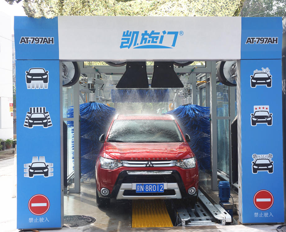 ?隧道式洗車原理是將車停在傳送帶上,由傳送帶帶動車子從洗車機的入口進,出口出,完成洗車指令。
